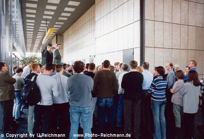 Bild 3: 14.03.2002 Die Zeit läuft ab... Versammlung im Eingangsbereich des Teletowers, kurz vor Ablauf der Abgabefrist für den Aufhebungsvertrag. (Versammlung ging bis 1440h) ( Nikon F 5 / 28-105mm / 584n5 )